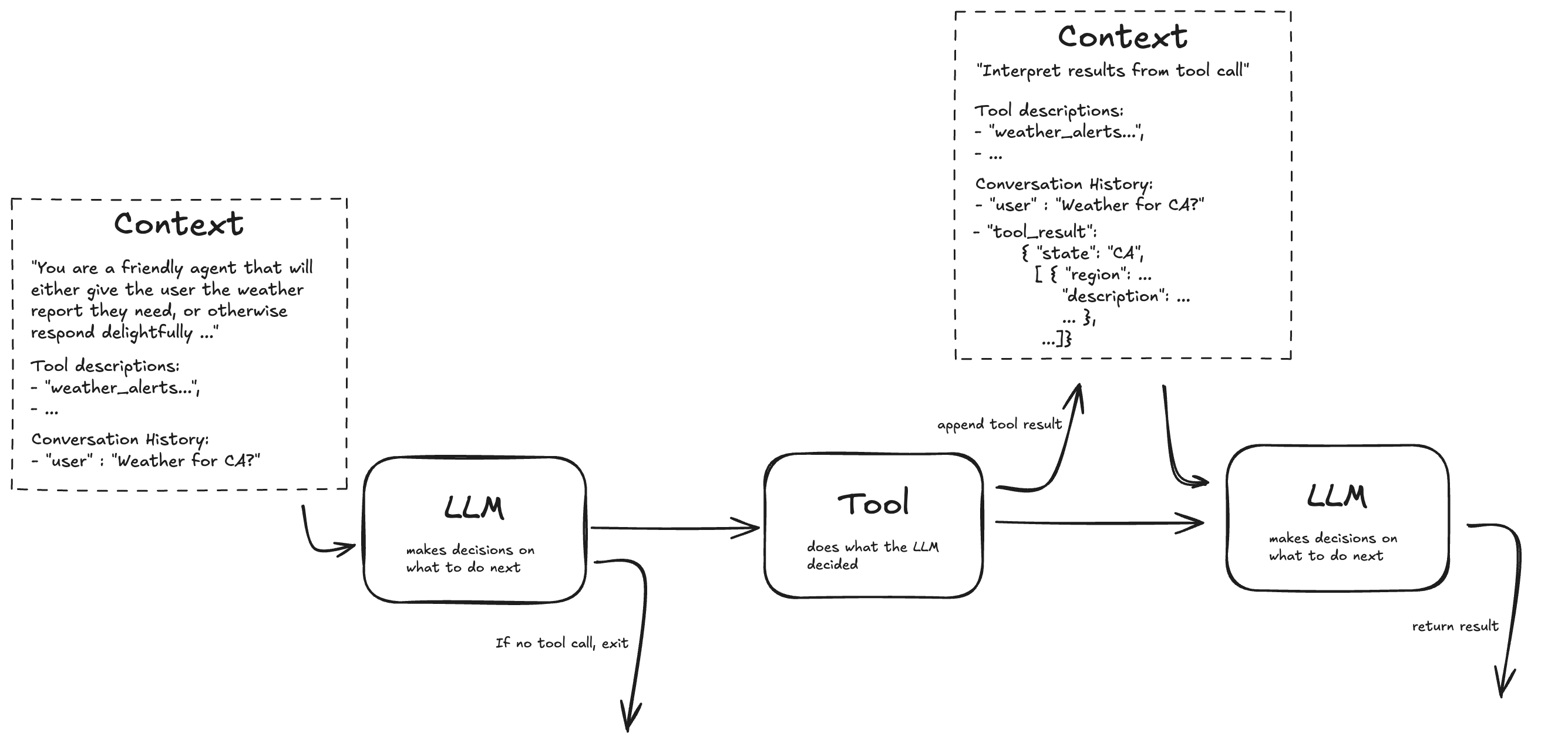 • We have intentionally not implemented the agentic loop so as to focus on how tool details are made available to the LLM and how functions are invoked. We do take the tool output and have the LLM interpret it in a manner consistent with the AI agent pattern.